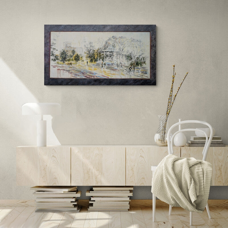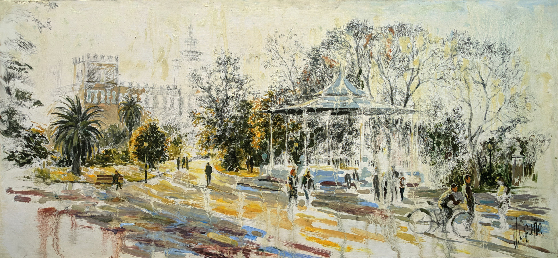With a meticulous and precious drawing that brings out all the talent —both the innate talent and that acquired over the years— of the Barcelona artist, this painting of the park of the Citadel of Barcelona is a unique jewel for its combination of realist and abstract styles, reinforced with this strong and aforementioned drawing base.