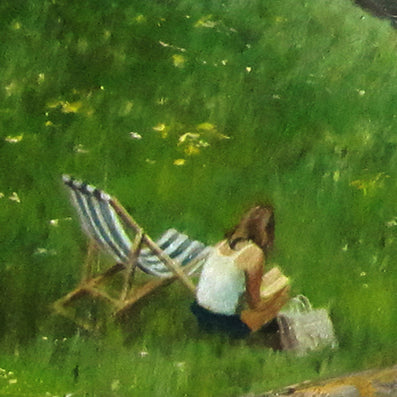 This summer view depicts a unique moment, with the sun peeking through the clouds and softly illuminating buildings and trees, with these exultant flowers - an element with a very successful volume - and with this girl reading quietly.