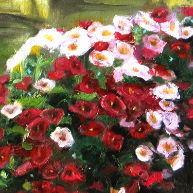 As I visited the city in summer, I tried to capture in the painting the exultation of nature that appears in the image. And as for the sun, although it is not direct but camouflaged by shy clouds, it lets us glimpse the warmth of its rays in the reflections of the trees, the buildings in the background or the flowers in the foreground.