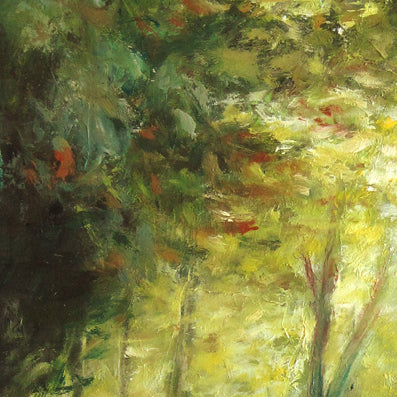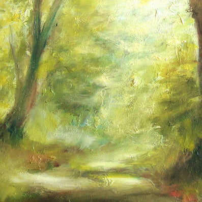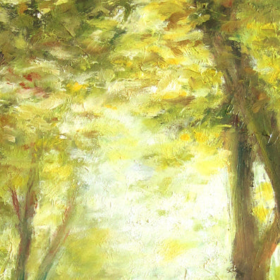 There are many paintings of forest paths but very few are as concise as this one. Just a few trees on either side of the path, a few colours that oscillate gently between a lemon yellow and a soft turquoise. Sometimes being concise and direct is a great asset.