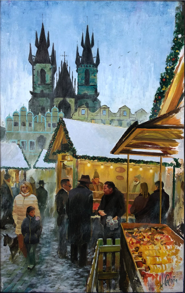 A narrative that makes it more realistic. Most artists who paint Prague paint it without a single person. This is excessively sad and disheartening. The passers-by strolling through the flea market greatly humanise the city scene, straddling the cold and the warmth, strolling from stall to stall, sharing pleasant conversations and shelter from the freezing cold.