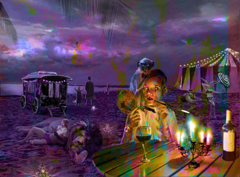 This is a digital photomontage that serves as a sketch of what will become these large paintings from the collection "Voices from Paradise Lost". This painting will measure 91 x 127 cms (35'8 x 50 inches), and is painted in oil on wooden board.