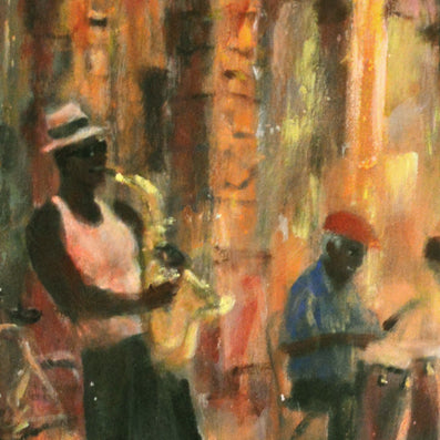 4. Extra company. Not only the three musicians are important. Every element is speaking and having a relationship with the protagonist and the spectator. The grandmother and the child watching from the balcony (also the bird), the palm trees or the sailboat, make up something special and frankly attractive.