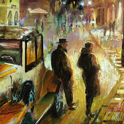 Like something out of a spy movie, this image made with oil, palette knife and brush on wood also has some abstract and blurred parts to increase the density of the atmosphere and bring it closer to a more dreamlike experience.