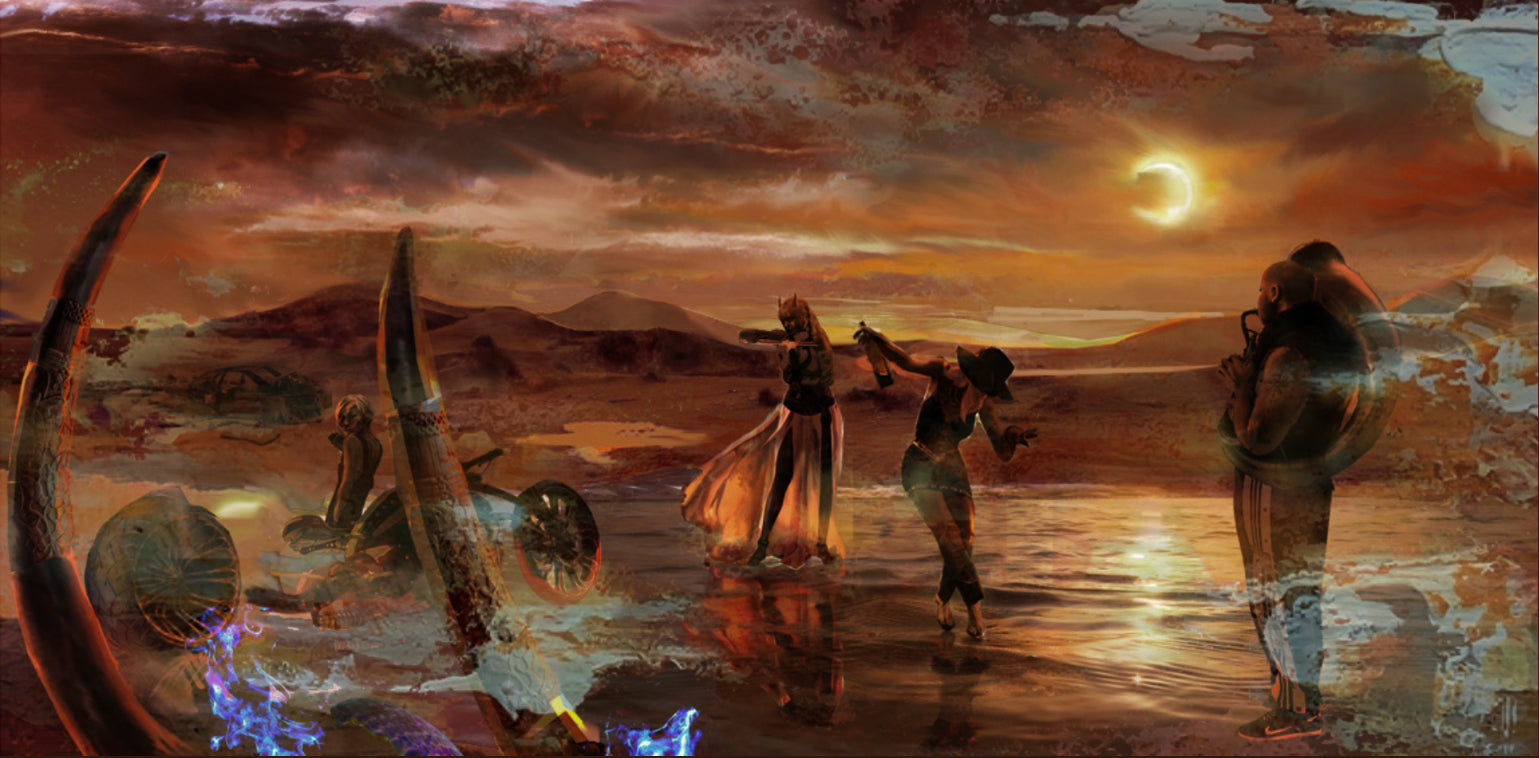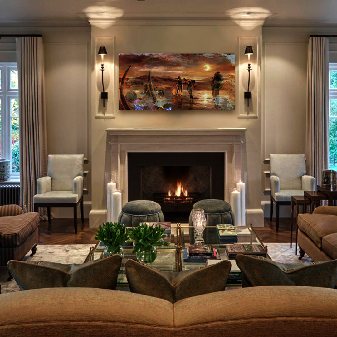 This is a digital photomontage that serves as a sketch of what will become these large paintings from the collection "Voices from Paradise Lost". This painting will measure 91 x 127 cms (35'8 x 50 inches), and is painted in oil on wooden board.