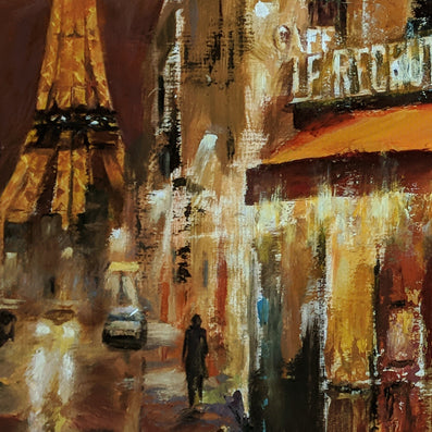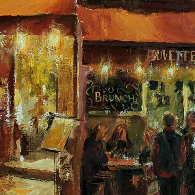 In many paintings of Paris we see an image of this city as it could be of other cities if it were not for the Eiffel Tower. The Parisian atmosphere of the restaurant and the street is perfectly defined here.